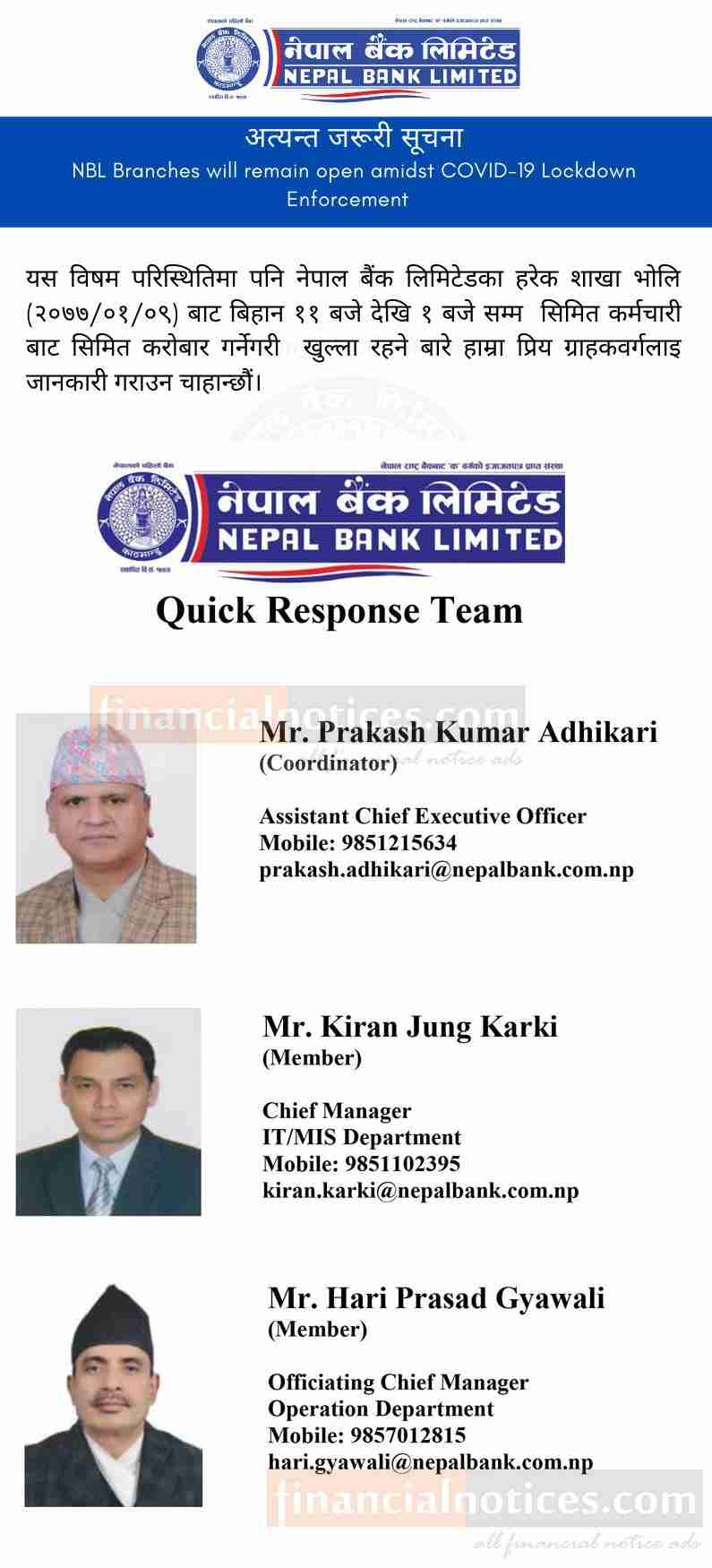 NBL Banking Hours & Quick Response Team Information