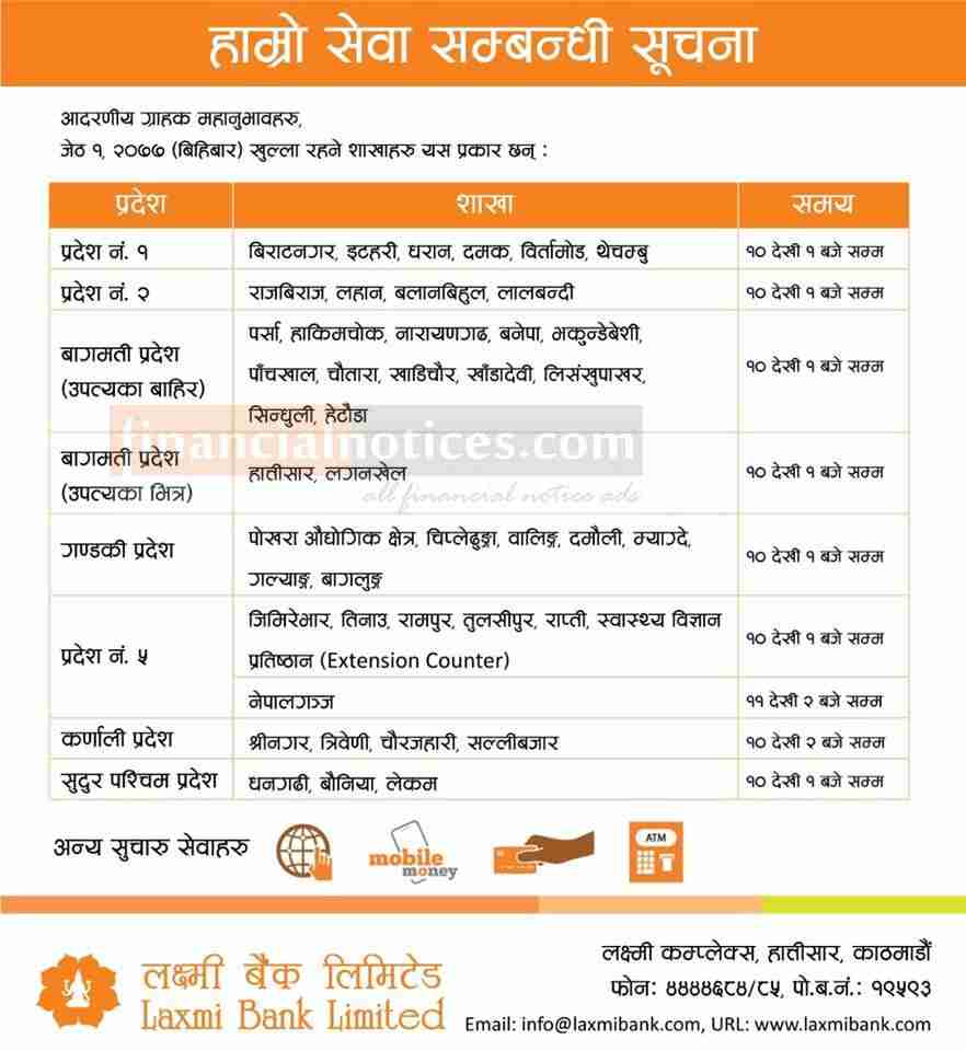 Laxmi बैंकको शाखाहरु खुल्ने सम्बन्धि सूचना