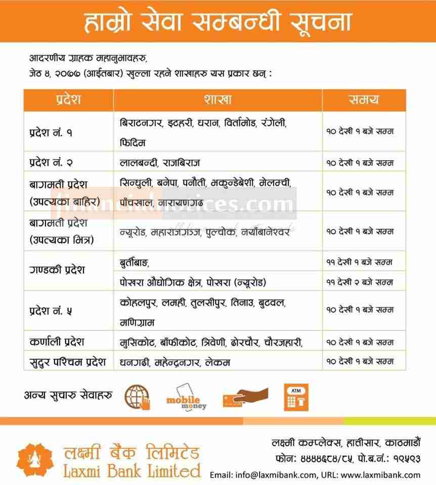 Laxmi बैंकको शाखाहरु खुल्ने सम्बन्धि सूचना