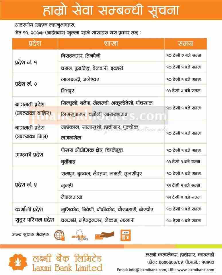 Laxmi बैंकको शाखाहरु खुल्ने सम्बन्धि सूचना