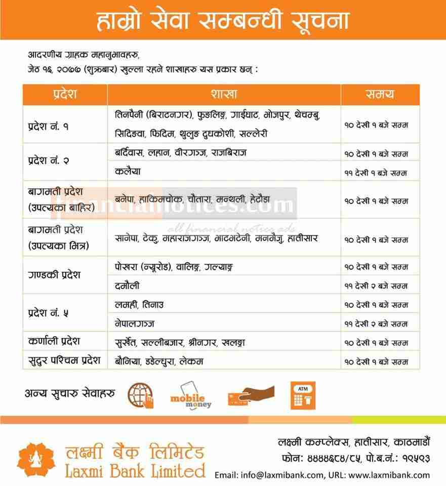 Laxmi बैंकको शाखाहरु खुल्ने सम्बन्धि सूचना