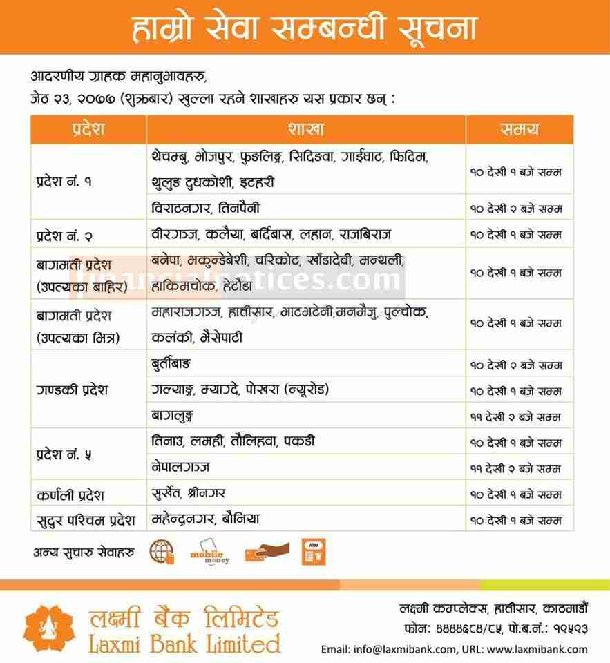 Laxmi बैंकको शाखाहरु खुल्ने सम्बन्धि सूचना