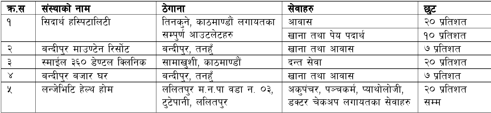 सम्झौता पश्चात महालक्ष्मी विकास बैंकका डेविट कार्ड, क्रेडिट कार्ड तथा मोबाइल बैंकिङ्ग प्रयोग गर्ने ग्राहकहरुले उक्त संस्थाहरुका विभिन्न सेवाहरुमा विशेष छुट प्राप्त गर्न सक्नेछन् । उक्त संस्थाहरु र प्राप्त गर्न सकिने छुट निम्नलिखित छन्ः